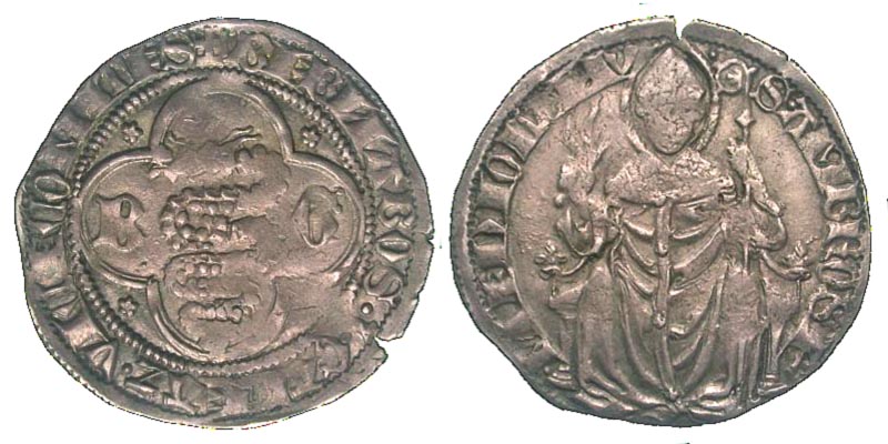 Italy, Milan. Barnabo and Galeazzo II Visconti. 1355-1378. AR grosso da 2 soldi (23.9 mm, 2.56 g, 7 h). + · GALEAZ · VICECOES · D · MEDIOLANI · 3C, coiled serpent flanked by B-G; all within quadrilobe / S · ABROSIV · MEDIOLAN, St. Ambrose mitred, nimbate, seated facing, holding scourge and crozier. CNI 10; Crippa 2A; Biaggi 1457. Toned VF.