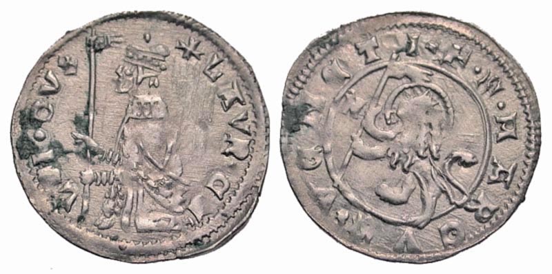 Italy, Venice. Lorenzo Celsi. Doge, 1361-1365. AR soldino (16.6 mm, 0.57 g, 10 h). + LAVR · CELSI · DVX, Doge kneeling left, holding banner with both hands / +·S · MARCVS · VENETI ·, Lion of St. Mark rampant left, holding banner; N in left field. CNI 8; Paulucci 2; Biaggi 2837. EF, small green spots.