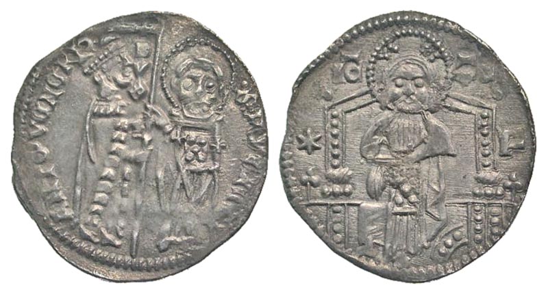 Italy, Venice. Antonio Veniero. Doge, 1382-1400. AR grosso (23.1 mm, 1.86 g, 6 h). ANTO VENERIO S M VENETI, DVX, doge standing left and St. Mark, nimbate, standing facing, both holding pendant between them; stars flanking / IC-XC, *-F in field, Christ, nimbate, seated facing on high-backed throne. CNI 16; Paulucci 2; Papadopoli 2; Scarfea 131. gVF.
