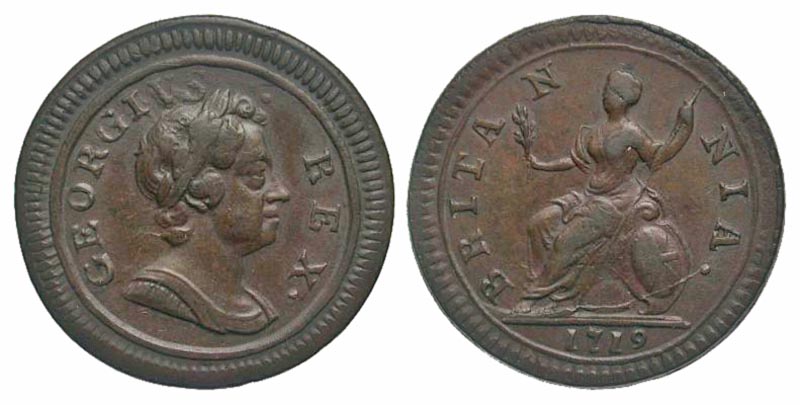 Lot 39-280. British, House of Windsor. George I. 1714-1727. AE farthing. Tower mint (London), Dated 1719.