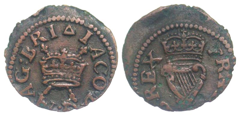 Ireland. James I. 1603-1625. AE farthing (17.0 mm, 0.56 g, 11 h). Type 3c. Lennox ï¾roundï¾; mm: Δ. Struck 1614-1625. · IACO : D · G · MAG : BRI , crown over crested scepters / FRA : ET : HIB : REX :, crowned harp. SCBC 2679; North 2135. VF, brown patina.