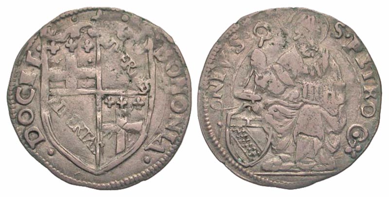 Papal States. Anonymous issue. 16th century AR carlino (23 mm, 1.97 g, 11 h). Bologna mint. City arms of Bologna / St. Petronius enthroned, holding crozier and city; to left, arms of Innocenzo Cybo. Berman 761. VF.