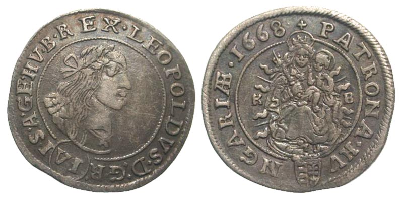 Bohemia. Leopold I 'The Hogmouth'. 1657-1705. AR 6 kreuzer (26.6 mm, 3.14 g, 12 h). Kormoczbanya mint, 1678. LEOPOLDVS · D : G · I · S · A · GE · HV · B · REX, laureate, draped, and armored bust right, wearing Order of the Golden Fleece, denomination in partial circle below / + PATRONA · HVNGARIAE, Madonna seated facing, holding infant in left hand and scepter in right hand; K to left, B to right. Huszár 1450. EF, toned, slight bend.