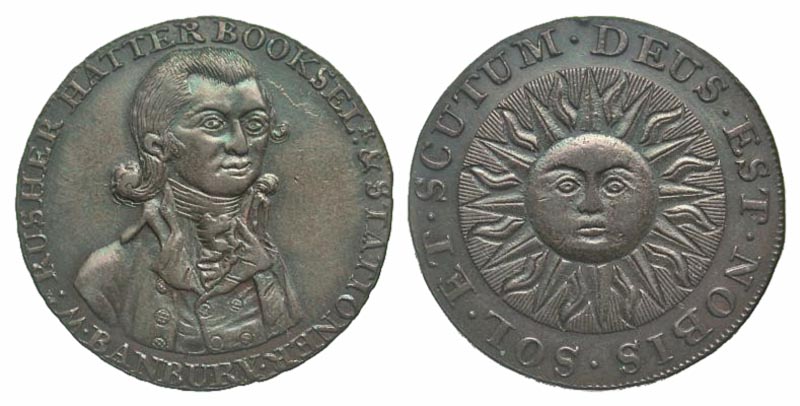 Great Britain, Oxfordshire. Danbury. ca. 1790's. AE 1/2 penny token (28.0 mm, 9.05 g, 6 h). WM RUSHER HATTER BOOKSELR & STATIONER BANBURY, his 3/4 facing bust / EUS EST NOBIS SOL ET SCUTUM // PAYABLE AT BANBURY OXFORD OR READING (on edge), sun. D&H 1. EF. Rare.