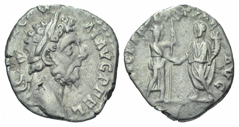 Commodus. A.D. 177-192. AR denarius (17.6 mm, 2.39 g, 11 h). Rome mint, Struck A.D. 191. L AEL AVREL COMM AVG P FEL, laureate head right / FELIC PERPETVAE AVG, Felicitas standing left, holding caduceus, clasping hands with Commodus standing right, who holds a cornucopia. RIC 249; RSC 120; BMCRE 337. aVF, irregular flan. Scarce.