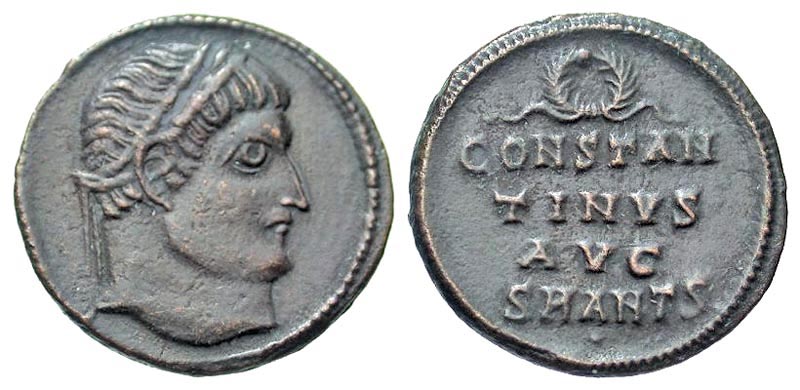 Constantine I. A.D. 307/10-337. AE follis (17.7 mm, 2.30 g, 5 h). Antioch mint, Struck A.D. 324-325. Rare. anepigraphic, laureate head right / CONSTAN/TINVS/AVG, in three lines across field; wreath above; SMANTS/ï¾. RIC 57; LRBC 1321. aVF.