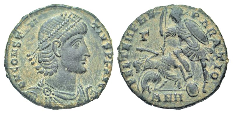 Constantius II. A.D. 337-361. AE centenionalis (21.5 mm, 4.09 g, 7 h). Antioch mint, Struck A.D. 351-355. D N CONSTANTIVS P F AVG, pearl-diademed, draped and cuirassed bust right / FEL TEMP REPARATIO, soldier spearing fallen horseman; Γ in left field, ANH in exergue. RIC 132; LRBC 2623. VF, attractive sandy patina.