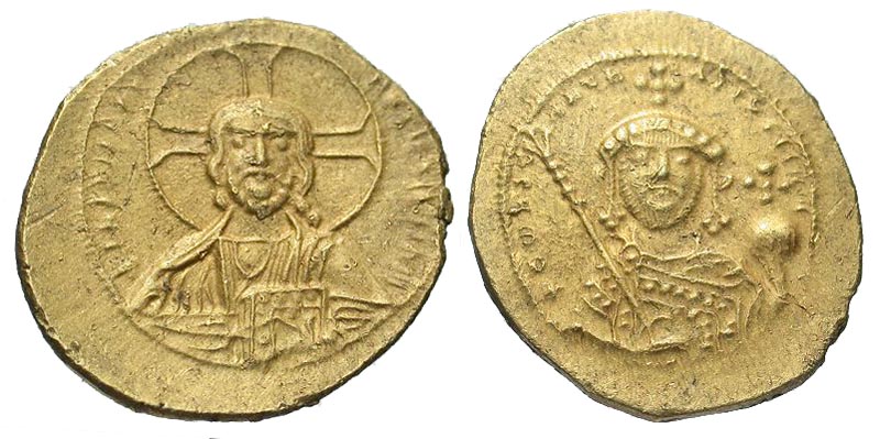 Constantine IX Monomachus. 1042-1055. AV tetarteron nomisma (20.9 mm, 4.00 g, 5 h). Constantinople mint. +IhS XIS RЄX RЄζNANTInM, facing bust of Christ Pantokrator / +CωnStANtn ЬASILЄЧS RM, crowned facing half-length bust of Constantine, wearing jewelled chlamys, holding scepter and globus cruciger. SBV 1832; DOC 5. aVF, off center.