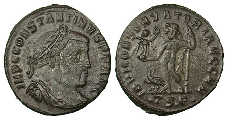 Constantine I. A.D. 307/10-337. Æ follis (23.6 mm, 4.16 g, 5 h). Thessalonica, A.D. 312-313. IMP C CONSTANTINVS PF AVG, laureate, draped, and cuirassed bust right / IOVI CONSERVATORI AVGG NN, Jupiter standing facing, head left, chlamys draped from shoulder, holding Nike and scepter, eagle with wreath at his feet; ·TS·Є· in exergue. RIC 61b. VF.