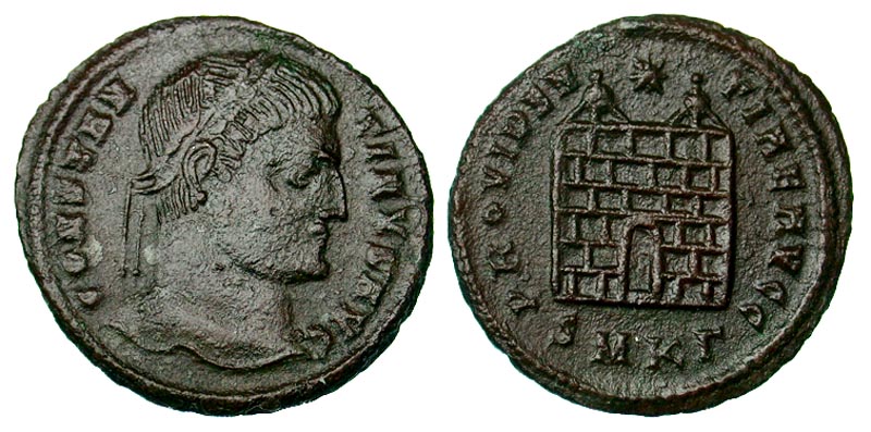 Constantine I. A.D. 307/10-337. Æ 3 (20.3 mm, 3.11 g, 1 h). Cyzicus, A.D. 324-325. CONSTANTINVS AVG, laureate head right / PROVIDENTIAE AVGG, campgate with two turrets and one star above; SMKΓ in exergue. RIC 24; LRBC 1158. VF.