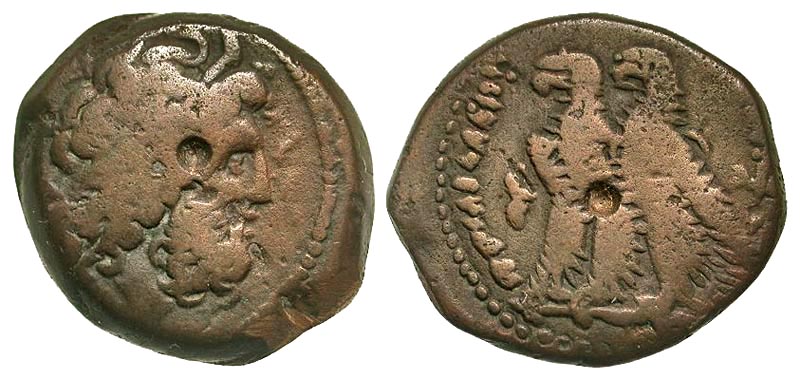 PTOLEMAIC KINGDOM. Ptolemy VI Philometor, 180-145 BC. AE20 (8.81 gm). Head of Zeus Ammon / Two eagles left on thunderbolt; in front, cornucopia. SNG.Cop.314. Svor.1426. aVF, smooth brown patina.