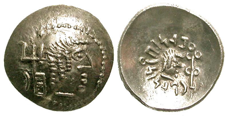 HIMYARITES. Amdan Bayyin, II Century AD. AR Scyphate Drachm (1.04 gm) of Raidan mint. Male head, monogram behind / Small male head with Himyarite legend around, scepter symbol to right. GIC.5718. Munro-Hay.3.4i. Toned Near Mint.
