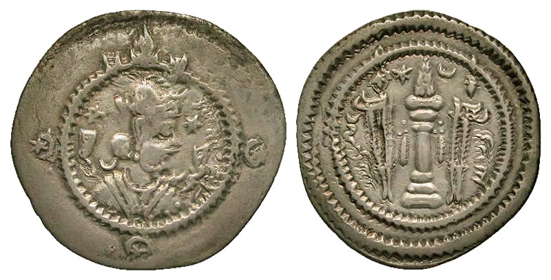 SASANIAN EMPIRE. Kavad I, 484, 488-497, 499-531 AD. AR Drachm (3.92 gm), Ray (DYNAN variety), yr. 34. Draped bust with winged crown / Fire-altar with attendants. Göbl.19. Toned VF+. Choice reverse.