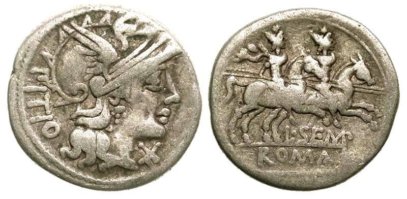ROMAN REPUBLIC. L. Sempronius Pitio, 148 BC. AR Denarius (3.86 gm). Helmeted head of Roma / the Dioscuroi riding. Sempronia.2. Cr.216/1. aVF.