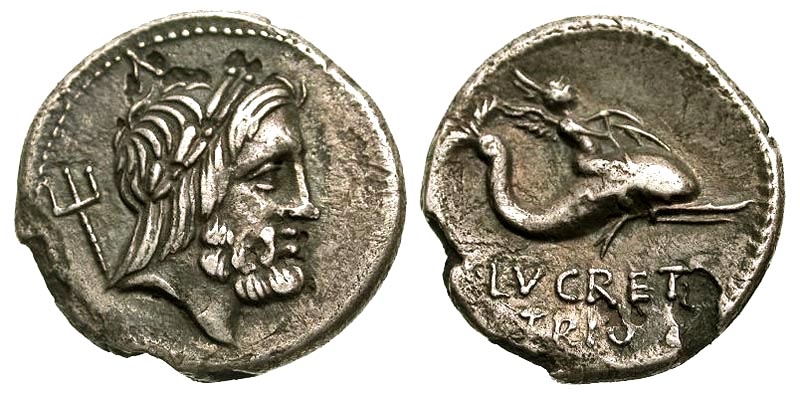 ROMAN REPUBLIC. L. Lucretius Trio, 76 BC. AR fourrée Denarius (3.14 gm). Laureate head of Neptune right / Cupid riding dolphin right. Lucretia.3. Cr.390/2. Toned VF+, planchet defects.