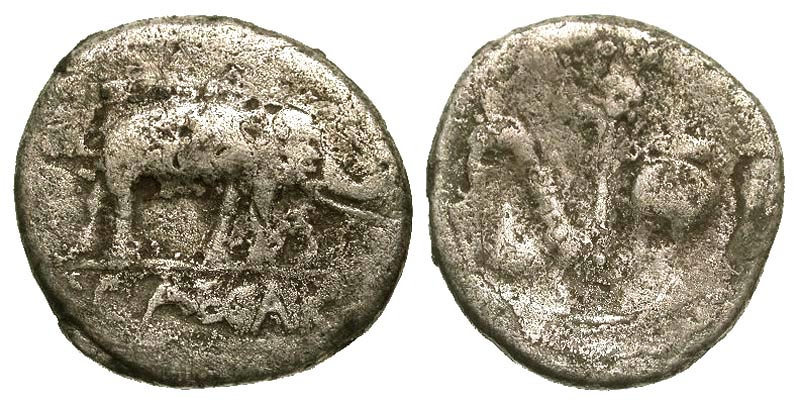 JULIUS CAESAR, died March 15, 44 BC. AR Denarius (3.26 gm). Elephant trampling serpent / Pontifical implements. Cr.443/1. RSC.49. Toned aFine, horn silver deposits.