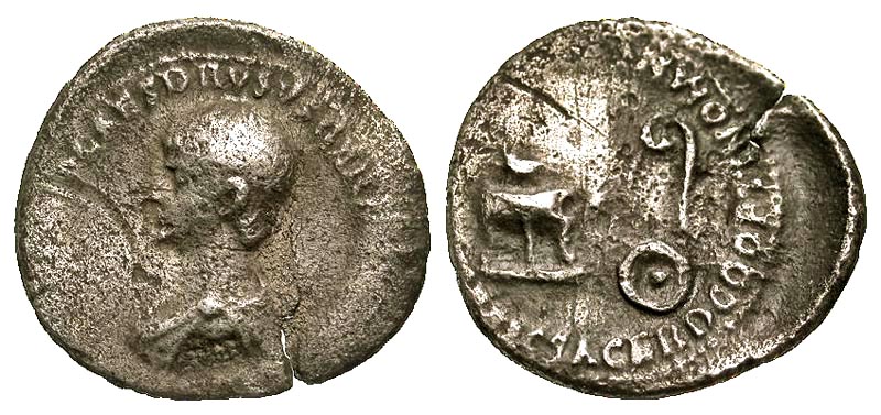 NERO, 54-68 AD. AR Denarius (3.30 gm) as Caesar. Bare-headed bust of Nero / Simpulum, lituus, tripod and patera. RIC.77(Claudius) (R2). RSC.312. Toned aVF, somewhat porous. Very Rare. ex. Neubecker collection.