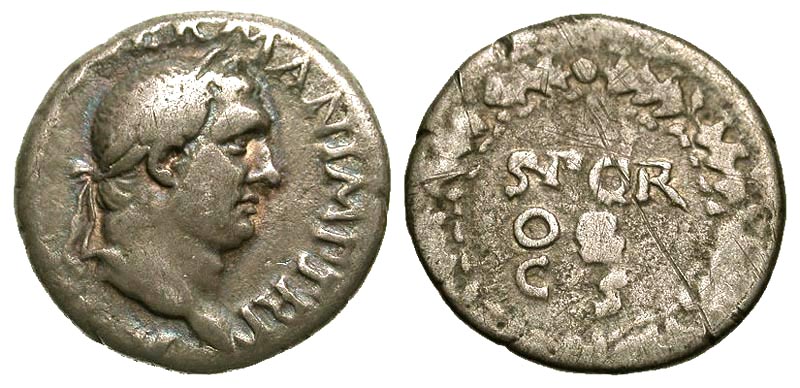 VITELLIUS, 69 AD. AR Denarius (3.04 gm), 69. Laureate head / SPQR OB CS in wreath. RIC.83. Toned aVF. Rare.