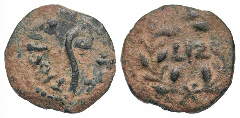 Judaea, Procurators. Pontius Pilate. 26-36 C.E. AE prutah (15.5 mm, 1.84 g, 11 h). Jerusalem mint, Dated year 17 = 30/31 C.E.. Prefect under Tiberius. LIZ, legend within wreath / TIBEPIOY KAICAPOC, lituus. Hendin 1342; Meshorer TJC 333; RPC 4968. VF, earthen patina.