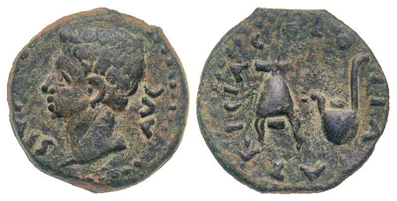 Hispania, Colonia Patricia. Augustus. 27 B.C.-A.D. 14 AE semis (21.3 mm, 5.45 g, 11 h). PERM CAES AVG, bare head of Augustus left / COLONIA PATRICIA, apex and simpulum. RPC 130; ACIP 3358; SNG Cop 468. VF.