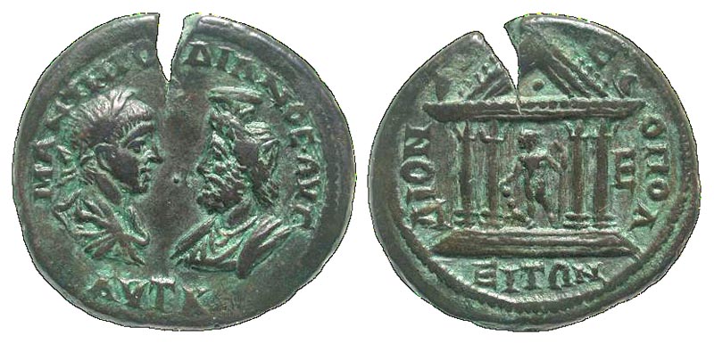 Moesia Inferior, Dionysopolis. Gordian III. A.D. 238-244. AE pentassarion (27.8 mm, 13.49 g, 12 h). M ANTΩ ΓOPΔIANOC AYΓ / AYT K, laureate, draped, and cuirassed bust of Gordian and draped bust of Serapis, wearing calathus, facing one another / ΔION-Y-C-OΠOΛ / EITΩN, tetrastyle temple, with pellet in pediment and containing statue of Dionysus holding scepter, panther at his feet; E to right. Jekov 53.16.2; Varbanov 582; AMNG 392. gVF, black patina with green highlights, flan crack.