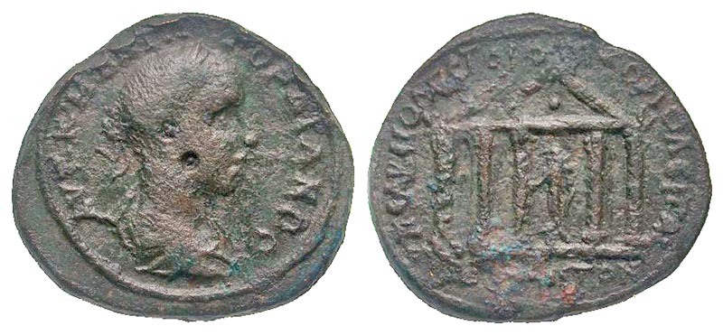 Moesia Inferior, Nicopolis ad Istrum. Gordian III. A.D. 238-244. AE tetrassarion (29.6 mm, 13.23 g, 1 h). Struck A.D. 241-244. Sabinius Modestus, magistrate. AVT K M ANT ΓOPΔIANOC AVΓ, laureate, draped, and cuirassed bust right / YΠ CAB MOΔЄCTOY NIKOΠOΛЄITΩN ΠPOC ICTPON, tetrastyle temple, within statue of Concordia, wearing kalathos, holding patera and cornucopia, globe in pediment. H&J 8.36.46.11; AMNG 2091; Varbanov 4250 var (Tyche within temple). Fine. Scarce type.