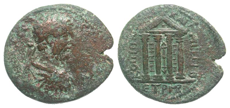 Pontus, Neocaesarea. Septimius Severus. A.D. 193-211. AE 33 (32.7 mm, 15.07 g, 6 h). AY K Λ CEΠ CEOYHPOC, laureate, draped and cuirassed bust right / KOI ΠON NЄO-KAI MHTPO, ЄT PMR, tetrastyle temple with wall visible in background, statue within; date below. Rec Gen 13; SNG von Aulock 100. aFine, flan chip.