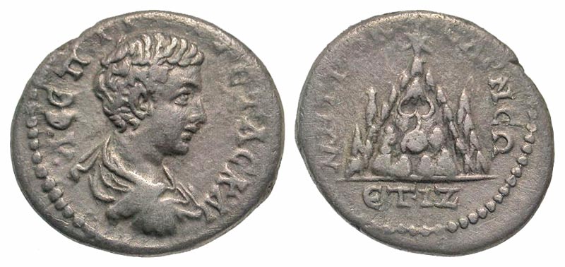 Lot 42-079. Cappadocia, Caesarea. Geta. A.D. 209-212. AR drachm. Dated RY 17 = A.D. 209. Very Rare.