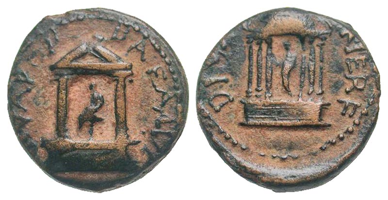 Syria, Trachonitis. Caesarea Paneas. Diva Poppaea and Diva Claudia. Died A.D. 65 and A.D. 63 respectively. AE 20 (20.0 mm, 5.03 g, 12 h). Struck under Gessius Florus or Marcus Antonius Julianus, ca. A.D. 65-68. DIVA POP-PAEA AVG, statue of Diva Poppaea seated left within distyle temple set on high podium / DIVA CLA-VD NER F, statue of Diva Claudia standing left on basis within hexastyle belvedere set on high podium.. RPC 4846; Meshorer, Caesarea pl. 7, H; Sofaer 87; Hendin 1270. aVF, black patina with orange highlights. This coin commemorates the passing of Nero's daughter,Poppaea, who died in infancy.