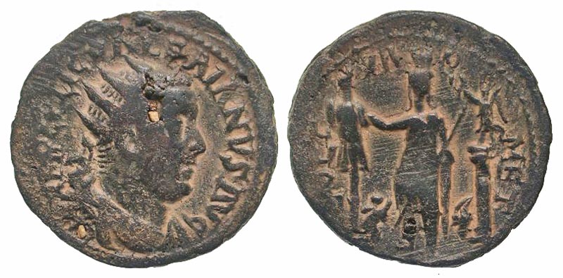 Phoenicia, Tyre. Valerian I. A.D. 253-260. AE 28 (28.3 mm, 14.18 g, 7 h). IMP CP LIC VALERIANVS AVG, laureate, draped and cuirassed bust right / COLT VRO MET, Astarte standing facing, placing right hand on trophy and holding scepter in left, being crowned by Nike on column; Marsyas to inner left, murex shell to inner right. Rouvier -; BMC 450 var; cf. SNG Cop 370 (Sev. Alex.). aVF, yellow highlights. Rare.
