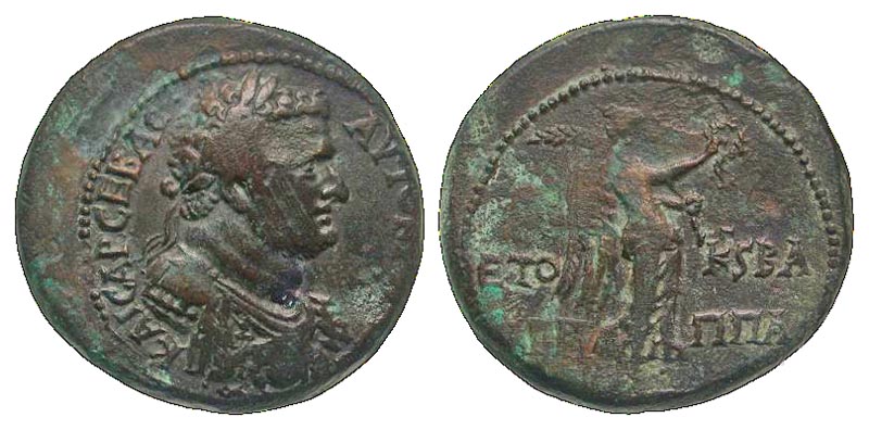 Judaea, Herodian Dynasty. Caesarea Paneas. Titus with Agrippa II. A.D. 79-81. AE 19 (26.5 mm, 11.49 g, 11 h). Dated year 26 (75/6 C.E.). AVTOKP TITOC KAICAP CEBAC, laureate head right / ETO-KSBA / AΓPI-ΠΠA, Nike advancing right, holding wreath in right hand and palm frond over left shoulder. RPC 2277; Hendin 1284; Meshorer 160; SNG ANS 290. VF, scratches and some areas of rough patina. Blue highlights.