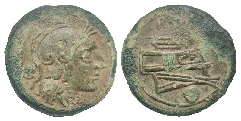 Anonymous. Ca. 215-212 B.C. AE uncia (22.1 mm, 6.59 g, 11 h). Post Semi-Libral standard. Rome mint. Helmeted head of Roma right, wearing Attic helmet; pellet behind / ROMA, prow of galley right; pellet below. Crawford 41/10; Sydenham 108. aVF, green patina.