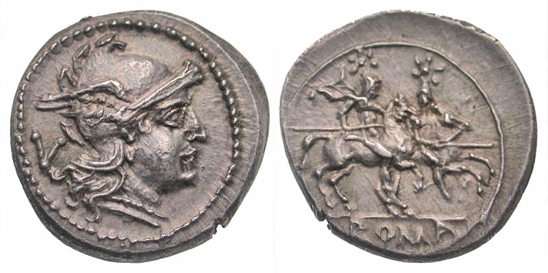 Anonymous. ca. 211-210 B.C. AR quinarius (16.5 mm, 2.21 g, 11 h). Mint in Apulia. Helmeted head of Roma right, wearing Phrygian helmet; V behind / ROMA, the Dioscuri riding right, each holds a spear, star above each. Crawford 102/2b; Sydenham 181a var. (Q on rev.); RSC 33i var. (same). EF, off center reverse. Very Rare.