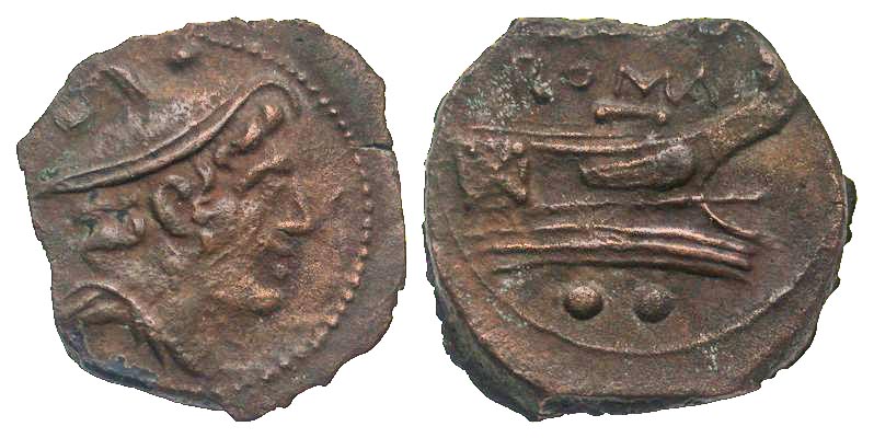 Anonymous. after 211 B.C. AE sextans (18.5 mm, 4.06 g, 4 h). Rome mint. Head of Mercury right, wearing petasos, two pellets above / ROMA, prow of galley right, two pellets below. Crawford 56/6; Sydenham 231d. aVF, jagged flan.