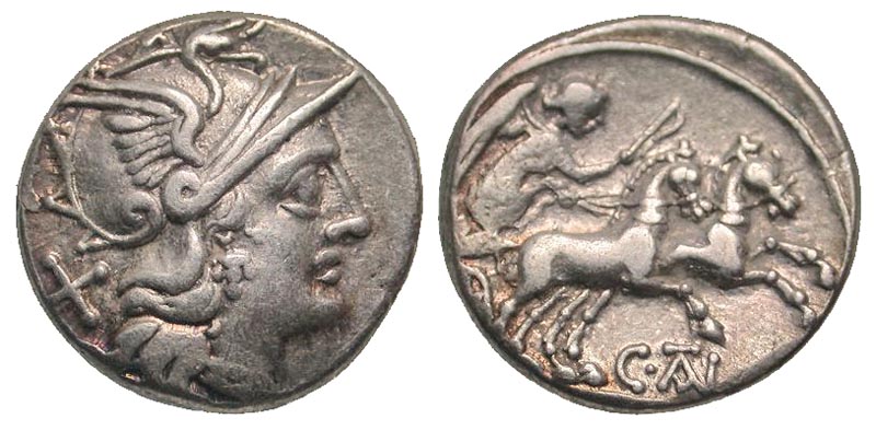 C. Thalna. 154 B.C. AR denarius (16.7 mm, 3.12 g, 8 h). Rome mint. Helmeted head of Roma right, X behind / ROMA , Victory driving galloping biga right, holding reins and whip, C·TAL mongram below horses. Crawford 162/2a; Sydenham 320; RSC Matiena 2. aVF, toned.