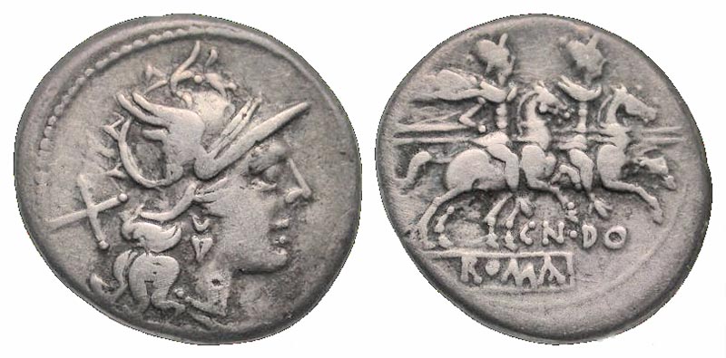 Cn. Domitius Ahenobarbus. 118 B.C. AR denarius (19.1 mm, 3.40 g, 9 h). Rome mint. Helmeted head of Roma right, X behind / ROMA within linear square, the Dioscuri riding right, holding spears; CN·DO below. Crawford 147/1; Sydenham 349; RSC Domitia 1. aVF. Scarce.