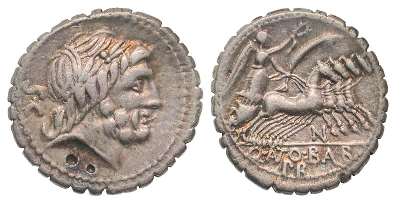 Q. Antonius Balbus. 83-82 B.C. AR serrate denarius (19.1 mm, 3.93 g, 4 h). Rome mint. S·C, laureate head of Jupiter right / Q·ANTO·BALB/PR, Victory driving quadriga right, holding wreath and palm; N below horses. Crawford 364/1d; Sydenham 742b; RSC Antonia 1. aVF, two banker's marks below neck.