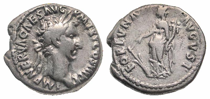 Nerva. A.D. 96-98. AR denarius (18.8 mm, 3.08 g, 5 h). Rome mint, Struck A.D. 97. IMP NERVA CAES AVG P M TR P COS III P P, laureate head right / FORTVNA AVGVST, Fortuna standing left, holding rudder on prow and cornucopia. RIC 16; BMCRE 37; RSC 65. VF.