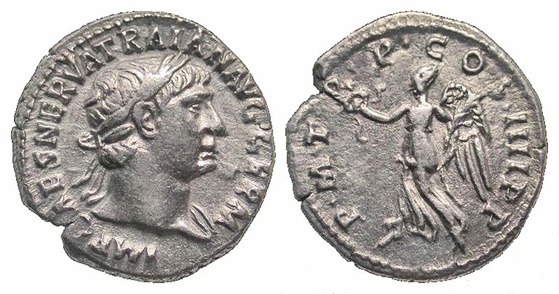 Lot 42-154. Trajan. A.D. 98-117. AR denarius. Rome mint, Struck A.D. 101-102.