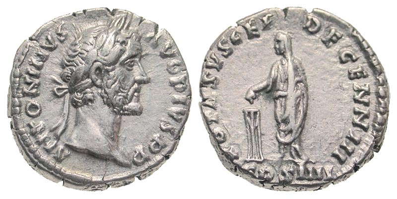 Antoninus Pius. A.D. 138-161. AR denarius (18.1 mm, 3.53 g, 6 h). Rome mint, Struck A.D. 157-159. ANTONINVS AVG PIVS P P, laureate head right / VOTA SVSCEP DEC III COS IIII, emperor, togate, standing left, dropping incense onto tripod altar. RIC 283a; BMCRE 585; RSC 1126c. VF. Scarce.