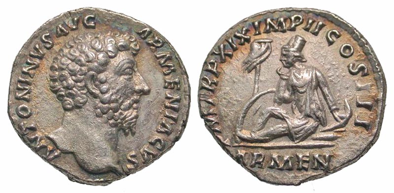 Marcus Aurelius. A.D. 161-180. AR denarius (18.0 mm, 2.61 g, 7 h). Rome mint, Struck A.D. 165. ANTONINVS AVG ARMENIACVS, laureate head right / P M TR P XIX IMP II COS III, ARMEN, Armenia seated left in attitude of mourning, left hand resting on bow and quiver; vexillum and shield behind. RIC 121; BMCRE 121; RSC 10. VF.