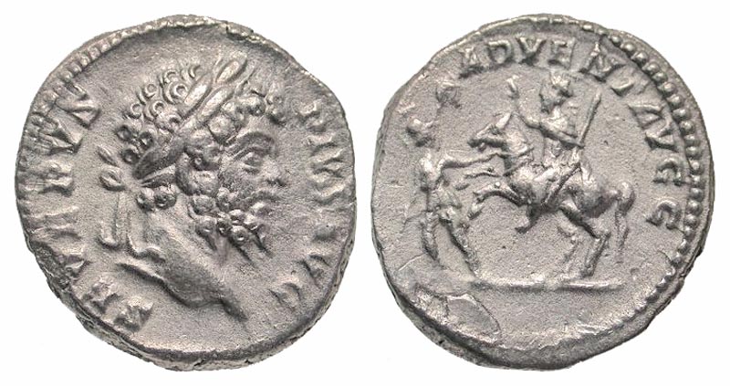 Septimius Severus. A.D. 193-211. AR denarius (18.5 mm, 2.36 g, 11 h). Rome mint, Struck A.D. 201-202. SEVERVS PIVS AVG, laureate head right / ADVENTI AVG, Severus on horseback left, raising hand and holding spear, being led by soldier. RIC 248; BMCRE 304; RSC 1. VF. Scarce.