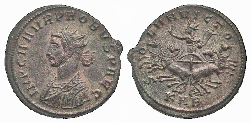 Probus. A.D. 276-282. AE antoninianus (23.2 mm, 4.21 g, 1 h). Serdica mint, Struck A.D. 277. IMP C M AVR PROBVS P AVG, radiate bust left in imperial mantle / SOLI INVICTO, Sol driving facing quadriga, head left, holding whip and raising hand; KAB in exergue. RIC 864. VF, silvered. Scarce bust type.