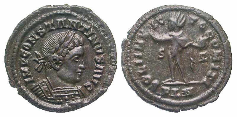 Constantine I. A.D. 307/10-337. AE follis (22.6 mm, 2.97 g, 7 h). London mint, struck A.D. 313-314. IMP CONSTANTINVS AVG, laureate and cuirassed bust right / SOLI INVICTO COMITI, Sol standing left, holding globe and raising right hand; S-F in fields, PLN in exergue. RIC 10. gVF, dark brown patina.