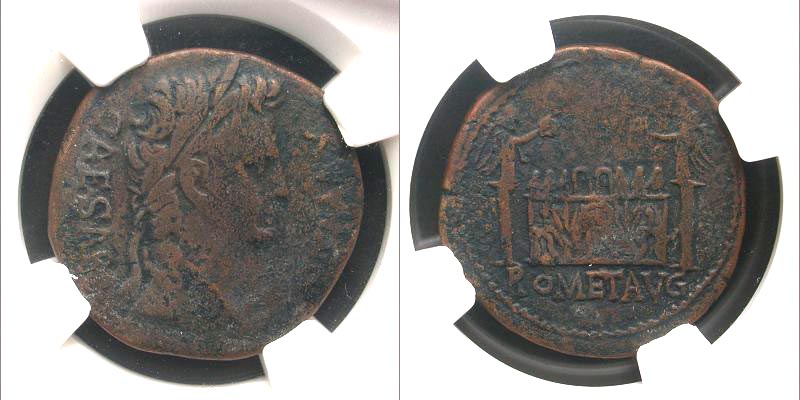 Augustus. 27 B.C.-A.D. 14 AE as (9.94 g). Lugdunum mint, struck 10-7 B.C. CAESAR PONT MAX, laureate head right / ROM ET AVG in exergue, front elevation of the Altar of Lugdunum, decorated with the corona civica between laurels, these being flanked by nude male figures; to left and right, Victories on columns, facing one another. RIC 230; BMCRE 549. NGC VF 5/5, 3/5.