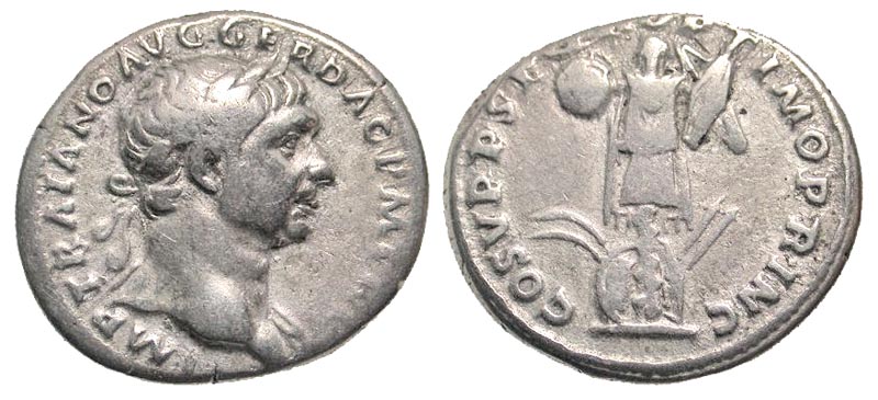 Lot 43-153. Trajan. A.D. 98-117. AR denarius. Rome mint, struck A.D. 107-111.