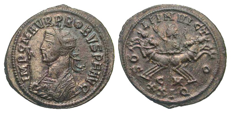 Probus. A.D. 276-282. AE antoninianus (22.4 mm, 3.61 g, 6 h). Cyzicus mint, struck A.D. 281. IMP C M AVR PROBVS PF AVG, radiate bust left in imperial mantle, holding eagle-tipped scepter / SOLI INVICTO, Sol driving facing quadriga, head left, holding whip and raising hand; CM//XXIQ in exergue. RIC 911. gVF.