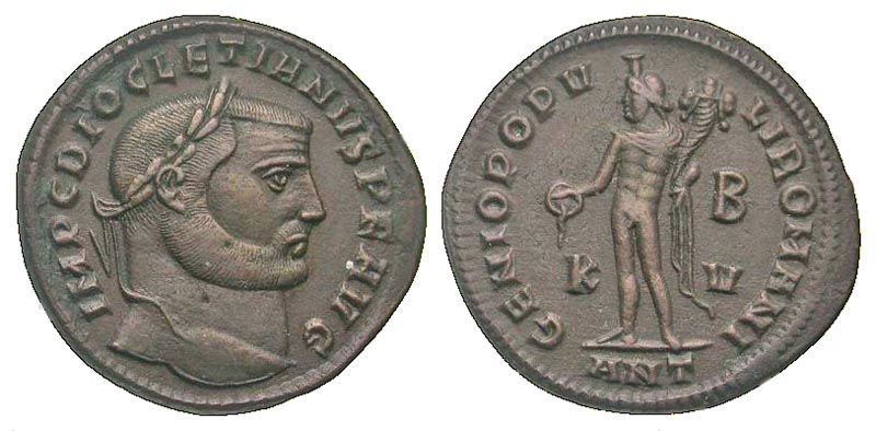Diocletian. A.D. 284-305. AE follis (27.1 mm, 8.67 g, 5 h). Antioch mint, struck ca. A.D. 300-301. IMP C DIOCLETIANVS P F AVG, laureate head right / GENIO POPV-L-I ROMANI, Genius standing left, holding patera and cornucopia; B/K-V/ANT in exergue. RIC 54a. VF.