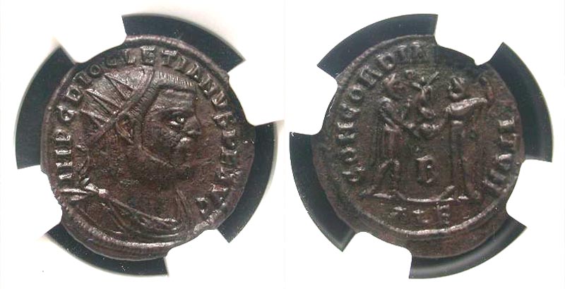 Diocletian. A.D. 284-305. AE post-reform radiate (2.60 g). Alexandria mint, struck A.D. 296-297. IMP C DIOCLETIANVS P F AVG, radiate, draped and cuirassed bust right / CONCORDIA MILITVM, emperor standing right, holding parazonium, receiving Victory on globe from Jupiter standing left, holding scepter; B between, ALE in exergue. RIC 46a. NGC AU 4/5, 3/5.