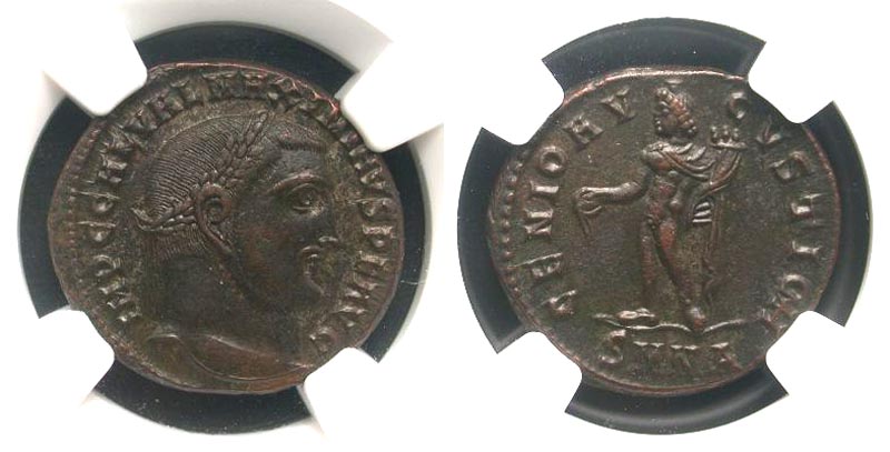 Maximinus II Daza. A.D. 309-313. AE follis (6.95 g). Nicomedia mint, struck A.D. 310-311. IMP C GAL VAL MAXIMINVS P F AVG, laureate head right / GENIO AVGVSTI CMH, Genius standing left, holding patera and cornucopia; SMNAin exergue. RIC 66c. NGC AU* 5/5, 5/5.